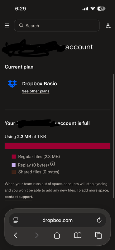 and it appears the only option for me (since I’m team admin) is to upgrade my subscription. 2gb is already far beyond what I will need for my backup so I don’t feel like paying. I have tried activating a trial just so I can sync my files and move them out but I’m encountering a site glitch that won’t allow me to do that either.
