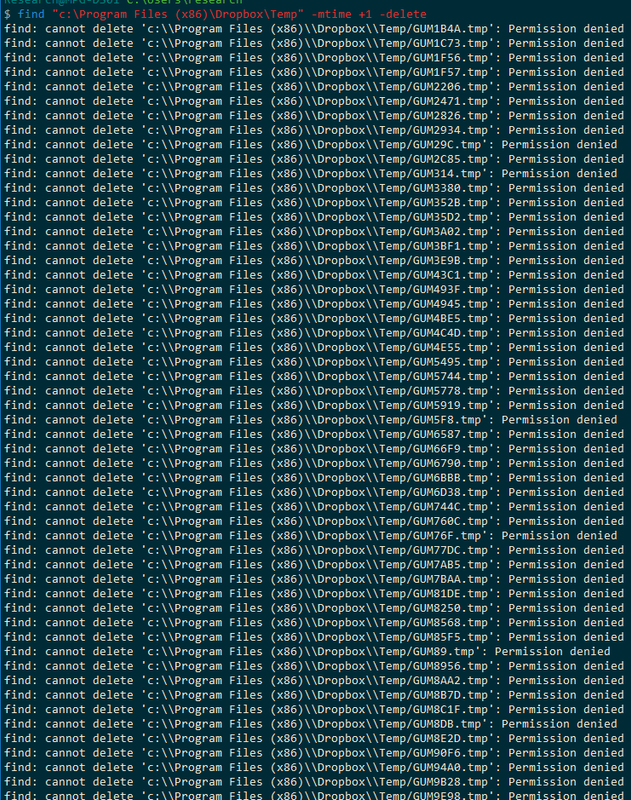 Filenames are illustrated below. (The errors are because I used cygwin's find command to try to delete everything, but the location requires admin rights. I removed them via GUI.)