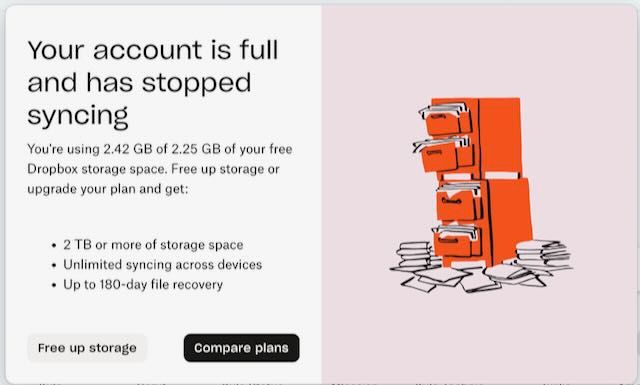 So Dropbox suddenly decides to throw up a modal window THAT CANNOT BE CLOSED on my macbook screen to tell me I'm out of space and stopped sync-ing?