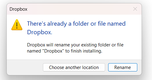 If it again tells you to chose another location or rename the existing folder, choose rename. At that point you have two options; a) let it sync everything into a new folder and LET IT WORK, or b) when the install is complete and it starts to sync, exit the Dropbox application, copy all of your files from your renamed Dropbox folder into the newly created Dropbox folder, and then launch Dropbox again only after the copy process is complete.