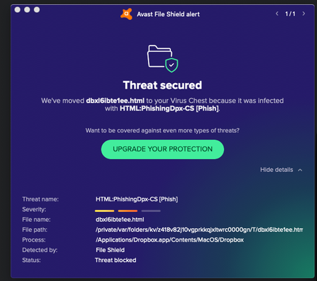 "Is this a phishing file in the dropbox app? Is it a false warning by Avast?"