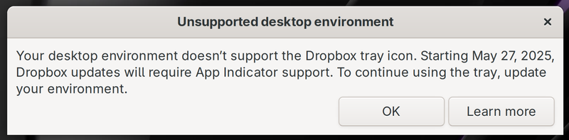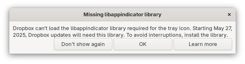 Recently when I start the dropbox desktop, it has a popup message saying I new version of dropbox will not work without AppIndicator, and it said my current environment doesn't support it. And I will not work after May 27.