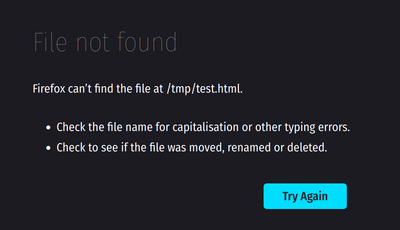 But here it is the problem. I tried to move the test.html file in the /tmp folder, and trying to re-open it as per the above produce the same error, File not Found, although in this case the file is there since it was manually created.