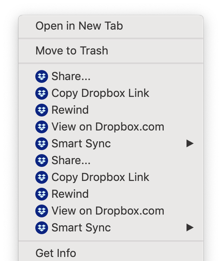Since few Days in my context menu the dropbox itemes are shown doubled. Also the smart-sync shows some folders with the "partly local arrow" even all files are online-only.