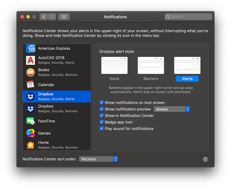 Under the Mac Notification Settings, i see two seperate options to change how i want the dropbox notification settings to appear.