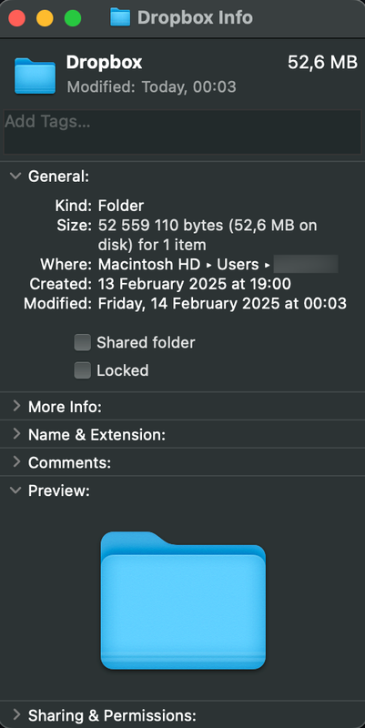 Also, please right click on your local Dropbox folder, go to Properties/Get info and send me a screenshot of what you see after that.