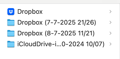 My ~/Library/CloudStorage now looks like this: https://www.dropbox.com/scl/fi/4e22dw1hjxvr6ws5ri9pa/Screenshot-2025-07-08-at-11.27.33.png?rlkey=vb3jsg7j37tg1iyfwhcyw54hq&st=kxbmyrrx&dl=0