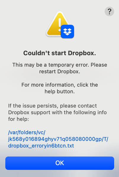 dropbox.mac.internal.MacError: [Errno -2001] Error Domain=NSFileProviderErrorDomain Code=-2001 "No valid file provider found with identifier ‘com.getdropbox.dropbox.fileprovider/78db2b29-cbe0-46df-bcb0-068ecd1b95a3’." UserInfo={NSLocalizedDescription=No valid file provider found with identifier ‘com.getdropbox.dropbox.fileprovider/78db2b29-cbe0-46df-bcb0-068ecd1b95a3’.}