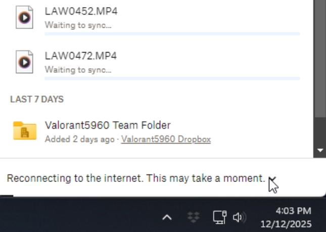 Dropbox is showing "Reconnecting to the internet. This may take a moment".