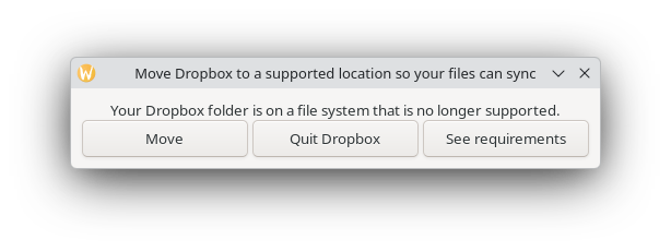 After doing this once, however, Dropbox is able to continue working; likely because the information in ~/.dropbox bypasses the broken file system check.