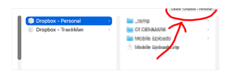 - Clicked the small "Delete - Dropbox - Personal" and "Delete Dropbox CompanyName" button in the Finder at the User/Library/Cloud Storage/.