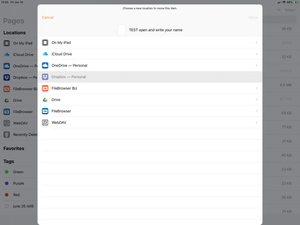 Can you let me know if this behaviour is only persistent within Pages? When trying to do a "move" within the Files app, do you also see that Dropbox is greyed out as shown in the screenshot above?
