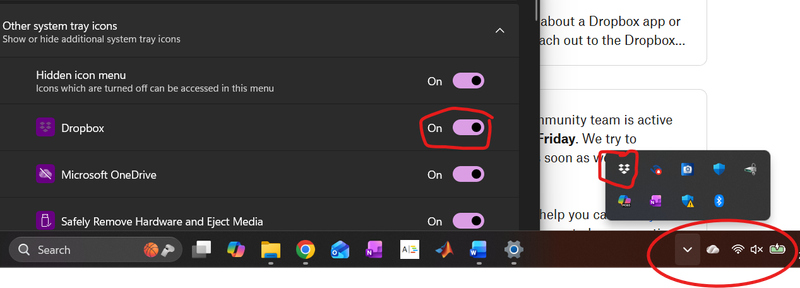 I am running the latest version of Dropbox Desktop on Windows 11 (25H2 version, build 26200.7840). I set the system tray manager to show the Dropbox icon, and everything worked as expected. With the most recent Windows update to 25H2, the icon no longer shows, although the program is running and can be accessed by clicking the "expand hidden icon" buttons. You can see from the screenshot below that the Dropbox is set to display in the Windows -> Settings -> Taskbar -> Other System Tray Icons menu, yet is not shown in the (circled) home icon area, although it can be accessed by expanding hidden icons. Doing the obvious things have not helped (shutting down Dropbox and restarting it, rebooting, turning off the "Show Dropbox on System Tray" option, rebooting, then turning the option back on). Anything I can do short of uninstalling the entire desktop program, rebooting, and then reinstalling it from scratch?