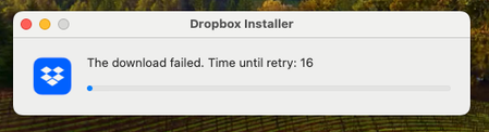 In a newly installed Mac Mini M2, after launching the Dropbox installer, the downloader immediately fails. It retries three times after waiting a certain amount of seconds (5, 10, 20...