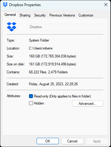 Other than that, I’d like you to right-click on your local Dropbox folder directly, go to its properties and send me a screenshot of the next window you’ll see.