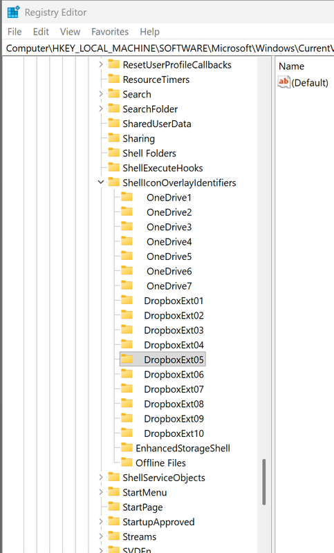 I am running latest versions of Windows 11 and Dropbox using just a single Dropbox account login. When I go into File Explorer, the right click option to see Dropbox has disappeared. I read a few of the possible solutions on this site, especially the one about max 15 Overlay Identifiers and the suggestion to move the options around to ensure Dropbox appears inside the first 15 in the Registry list. However, if you look at below, OneDrive is using positions 1-7 and Dropbox is using 8 to 17. I am not sure how to manage this without causing problems with OneDrive. Any help will be very much appreciated!