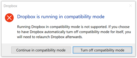 During last few days, I've tried and observed that if I choose to "Continue in compatibility mode", the dropbox seems to work well with normal syncing function.