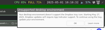 Dropbox says my environment doesn't support tray icon on a Linux device, by it does.