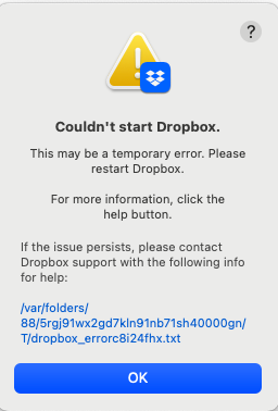 dropbox.mac.internal.MacError: [Errno -2001] Error Domain=NSFileProviderErrorDomain Code=-2001 "No se encontrĂł ningĂșn proveedor de archivos con el identificador com.getdropbox.dropbox.fileprovider/05919eb4-cd51-425b-9d84-250c5e335753." UserInfo={NSLocalizedDescription=No se encontrĂł ningĂșn proveedor de archivos con el identificador com.getdropbox.dropbox.fileprovider/05919eb4-cd51-425b-9d84-250c5e335753.}
