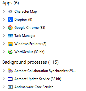 Nothing obvious turns up in Task Manager; here's the app list and the first few background processes. (WordGenius is a dictionary app with no interest in content on my SSD.)