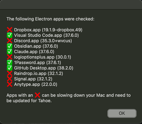 That tool looks up what version of Electron we're using and infers from the version that our app will cause the Tahoe performance issue, but we patched our Electron fork to address the issue, so even though we're on an older version we won't actually cause the performance regression.