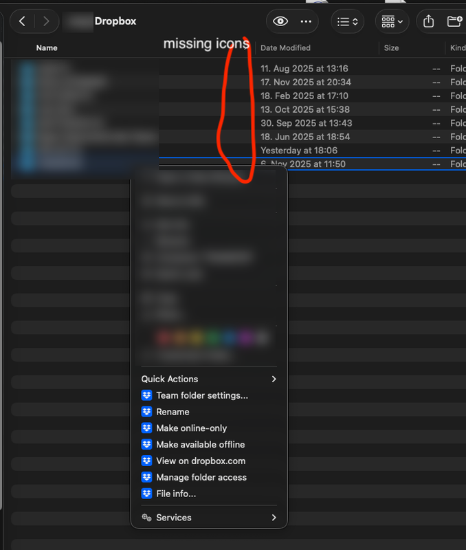 Online-only files in my Dropbox folder show as 0 KB and download/open fine on double-click, but there are no Dropbox right-click options in Finder (no “Make available offline”, no “Online-only”, no Dropbox submenu).