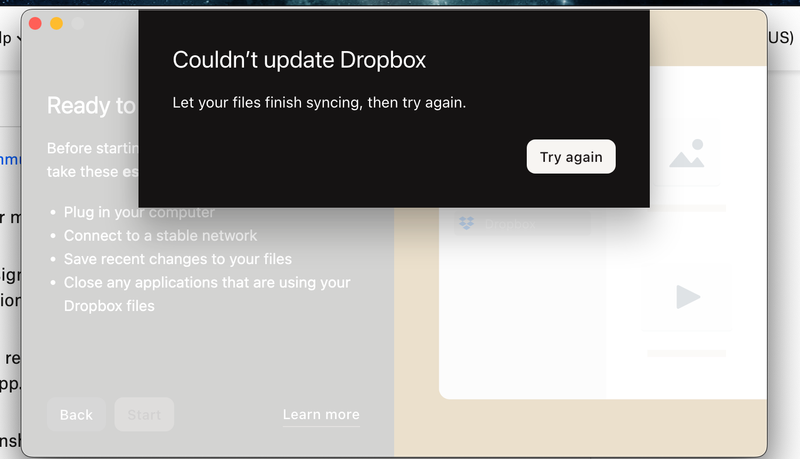The trouble is, I don't have enough hard-drive space to enable it to fully resync, and I'm worried that there might be data in the file-provider folder that never actually synced to dropbox online, so I can't delete anything. And it won't let me re-update to file provider until everything is synced. Which it can't because of the lack of harddrive space.