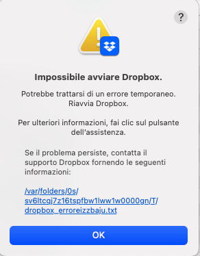 quando cerco di avviare l'app Dropbox su Mac mi compare il messaggio "Impossibile avviare Dropbox". L'app ha sempre funzionato sino a ieri. Cosa posso fare? Ho già provato a disinstallare e reinstallare il programma invano.