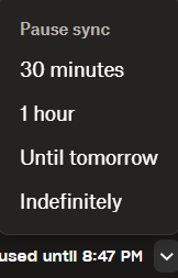 I paused syncing syncing last week "indefinitely." Now, I want to resume. But there is no way to do so. The bottom text of the app window pop-up just says "Syncing paused." That text is not clickable. The drop down next to it only lets you select how long to pause for. There is no "Resume." Yes, I have restarted the app and my PC. This is insane.z