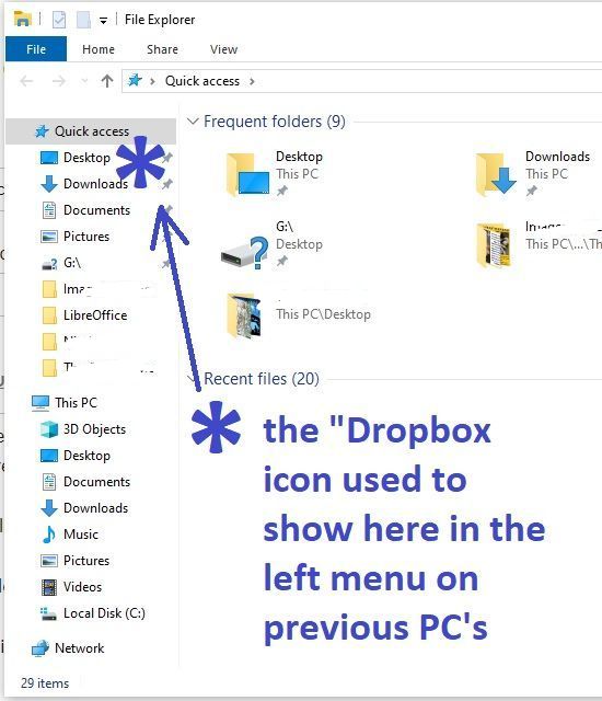 Dropbox no longer shows in File Explorer? I can no longer open Dropbox files with Libre Office? How do I add Dropbox so I can see it in File Explorer?