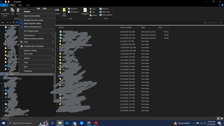 Here is a screenshot of what I see in my local Dropbox folder. I right-clicked the mouse on the Dropbox folder and the menu that you see below appears. I go to "Manage Hard Drive Space", go through the motions of either using Selective Sync or moving files to Online Only (I've tried both) and it appears to all work. However, as soon as I open the local folder all the files and folders that were suppose to be moved off my local hard drive are still there (all 75 GB worth):