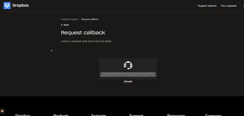 Used callback request, and I get this: "You are being helped by Dropbox Support." What does this mean? It's been over two hours. After twenty years, I guess I have to move on. I lose work when I can't get people their files.