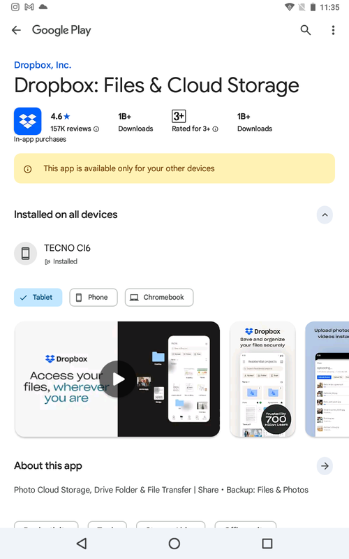 I see an error that the Dropbox app isn't available to install on my Android 13 tablet.