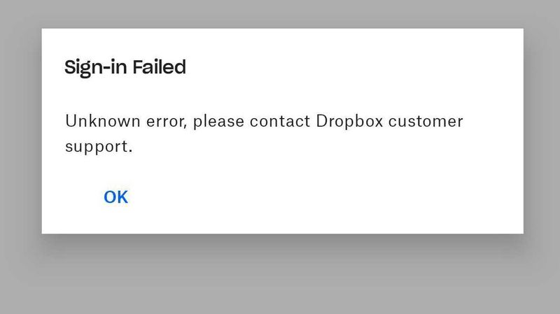 When I try to log in to the Dropbox app on my Android phone, I get the same error no matter what I choose — either “Sign in with Google” or by typing my email and password. The error says: “Unknown error, please contact Dropbox support.”