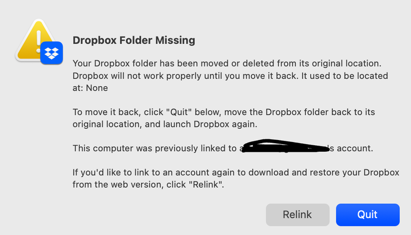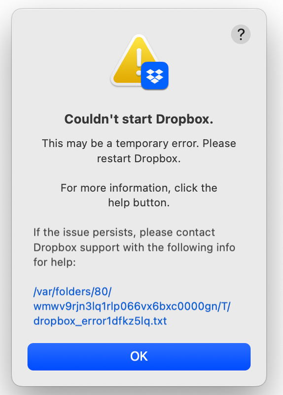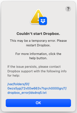 - RockWarrior5 months agoExplorer | Level 3bn.BUILD_KEY: Dropboxbn.VERSION: 228.4.5567bn.constants.WINDOWS_SHELL_EXT_VERSION: 80bn.is_frozen: Truemachine_id: 24bad416-b43f-52a8-9ff3-909263253e76pid: 2248ppid: 1uid: 501user_info: pwd.struct_passwd(pw_name='brian', pw_passwd='********', pw_uid=501, pw_gid=20, pw_gecos='MYNAME', pw_dir='/Volumes/Crucial X10', pw_shell='/bin/zsh')effective_user_info: pwd.struct_passwd(pw_name='brian', pw_passwd='********', pw_uid=501, pw_gid=20, pw_gecos='MYNAME', pw_dir='/Volumes/Crucial X10', pw_shell='/bin/zsh')euid: 501gid: 20egid: 20group_info: grp.struct_group(gr_name='staff', gr_passwd='*', gr_gid=20, gr_mem=['root'])effective_group_info: grp.struct_group(gr_name='staff', gr_passwd='*', gr_gid=20, gr_mem=['root'])DYLD_LIBRARY_PATH: Nonecwd: '/'real_path='/'mode=0o40755 uid=0 gid=0parent mode=0o40755 uid=0 gid=0HOME: '/Volumes/Crucial X10'appdata: '/Volumes/Crucial X10/.dropbox/instance2'real_path='/Volumes/Crucial X10/.dropbox/instance2'mode=0o40700 uid=501 gid=20parent mode=0o40755 uid=501 gid=20dropbox_path: Nonenot foundparent not foundsys_executable: '/Applications/Dropbox.app/Contents/MacOS/Dropbox'real_path='/Applications/Dropbox.app/Contents/MacOS/Dropbox'mode=0o100755 uid=501 gid=20parent mode=0o40755 uid=501 gid=20trace.__file__: '/Applications/Dropbox.app/Contents/Resources/python-packages.zip/dropbox/client/ui/common/boot_error.pyc'real_path='/Applications/Dropbox.app/Contents/Resources/python-packages.zip/dropbox/client/ui/common/boot_error.pyc'not foundparent not foundtempdir: '/var/folders/5f/0wzs5ypj72v00w663v7tqrch0000gn/T'real_path='/private/var/folders/5f/0wzs5ypj72v00w663v7tqrch0000gn/T'mode=0o40700 uid=501 gid=20parent mode=0o40755 uid=501 gid=20Traceback (most recent call last):File "desktop/dropbox/client/main.py", line 6861, in _setup_root_for_accountFile "desktop/dropbox/sync_root/helpers.py", line 207, in create_root_for_accountFile "desktop/dropbox/foundation/futures/basic.py", line 932, in resultFile "desktop/dropbox/trace.py", line 351, in newfnFile "desktop/dropbox/sync_root/handlers/macos/file_provider.py", line 333, in _completion_domainsFile "desktop/dropbox/sync_root/handlers/macos/file_provider.py", line 320, in set_result_or_convert_exceptionFile "desktop/dropbox/foundation/futures/basic.py", line 749, in set_resultFile "desktop/dropbox/foundation/futures/basic.py", line 712, in _on_postFile "desktop/dropbox/foundation/futures/basic.py", line 1131, in _stage1File "desktop/dropbox/foundation/futures/basic.py", line 991, in _when_doneFile "desktop/dropbox/foundation/futures/basic.py", line 1150, in _stage2File "desktop/dropbox/foundation/futures/basic.py", line 749, in set_resultFile "desktop/dropbox/foundation/futures/basic.py", line 712, in _on_postFile "desktop/dropbox/foundation/futures/basic.py", line 1112, in _stage1File "desktop/dropbox/foundation/futures/basic.py", line 455, in _then_callbackFile "desktop/dropbox/sync_root/handlers/macos/file_provider.py", line 1043, in _init_completionFile "desktop/dropbox/trace.py", line 351, in newfnFile "desktop/dropbox/sync_root/handlers/macos/file_provider.py", line 969, in _init_completion_innerdropbox.mac.internal.MacError: [Errno 19] Error Domain=NSPOSIXErrorDomain Code=19 "Operation not supported by device"