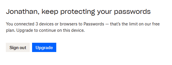 I have a Basic plan with 3 devices authorized. I am working from one of the 3 devices, and while logged in to Dropbox, it will not allow me to access Dropbox Passwords, saying I am already logged in to 3 devices. This is clearly an error, and I should not have to log out from one of my other devices to access. Can someone help?