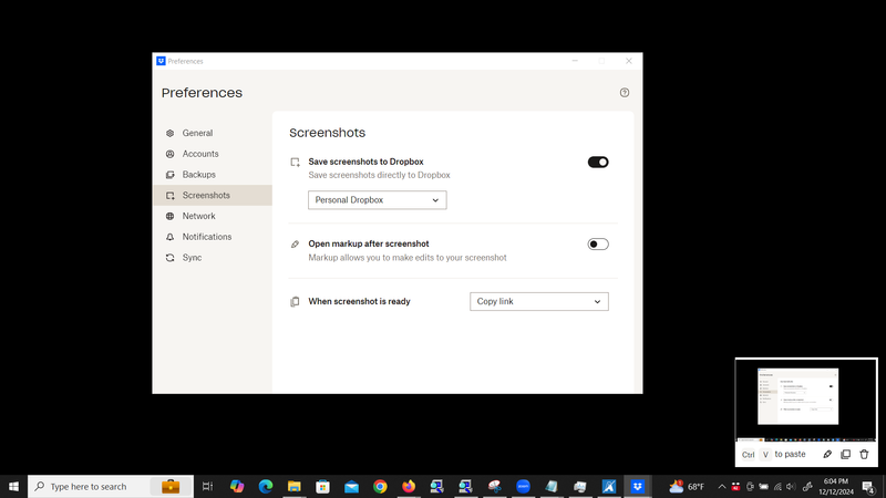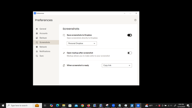 Yes, there is. Please look up at the screenshot that has the Dropbox Preferences window. It has a Screenshots tab, and I have the "Save Screenshots to Dropbox" toggle switch set to on. That is a Dropbox window, not a Windows window.