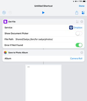 I’m trying to use Siri Shortcuts on iOS 12 to share photos using a shared Dropbox folder. I’ve written a workflow that successfully saves selected photos from the iOS Photos app (or elsewhere) to a s...