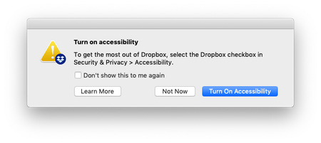I'm running Dropbox for Mac v58.4.92, and every time I log in to my machine, I get a message from Dropbox asking me to turn on accessibility: