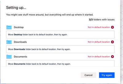 Thanks, Walter. I appreciate your help! I went ahead and started to try that. When I clicked "Setup," this happened. Confusingly, the file path for each folder is /Users/[myusername]/[Folder]. I would figure that was the default location.