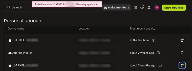 I have tried unlinking it from the web UI under Security > Devices, but every time I try, I get a little error notification that says "Failed to unlink [computer]. Please try again later."