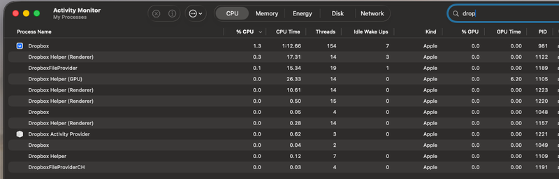 I also opened Activity Monitor, and searched for Dropbox. Here is what that looks like: