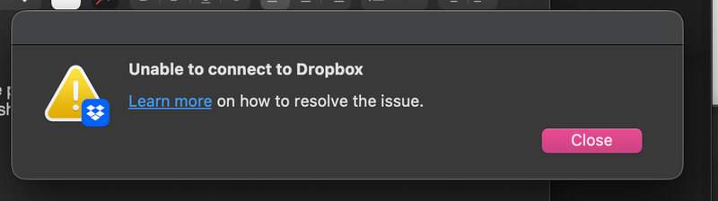 Thanks for these suggestions. Unfortunately the problem is now worse than before. I tried to perform an advanced reinstall. Not sure that worked at the Terminal stage (I'm on Mac). I signed out of Dropbox web. Then I re-installed Dropbox. Only now this time it was stuck at the "Starting" stage and every attempt to sign in prompted this pop-up window, "Unable to connect." Screenshots attached. This is extremely frustrating to say the least.