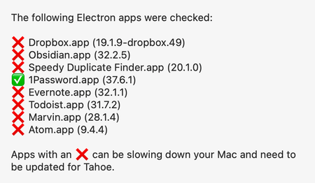 The Mac community has been made aware that apps making use of the electron framework leading to significant slowdowns in Mac OS 26 (Tahoe). A previous posting here noted that Dropbox is one such ap...