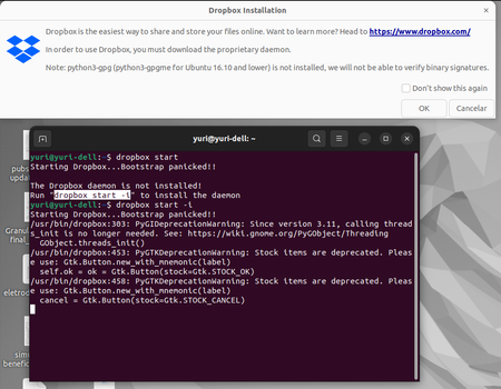 /usr/bin/dropbox:303: PyGIDeprecationWarning: Since version 3.11, calling threads_init is no longer needed. See: https://wiki.gnome.org/PyGObject/Threading