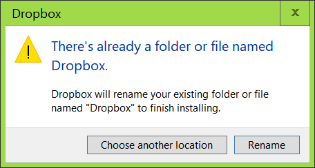 Are you referring to the dialogue box that mentions "There's already a folder or file named Dropbox"? If so, can you click "Choose another location"?