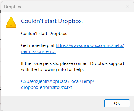 I've been using Dropbox successfully for 10+ years. Last week I started getting an error message - see below. I double checked to see if documents created on my computer are syncing to Dropbox onlin...