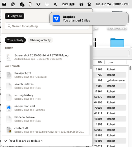 I can see syncing occurring with the dropbox notification icon on the Mac. When I look, syncing runs. When it completes, instead of showing what was just synced, it only shows files synced the previo...