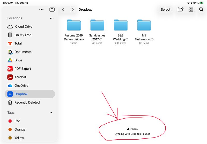 I have an iPhone 14 and iPad Air 4th generation. When I go to files app, under Dropbox it shows Syncing with Dropbox paused. This is only happening on my iPad works fine on iPhone. Spoke with Apple and said it’s a Dropbox issue. I have removed Dropbox app and reinstalled it. Signed out and in, reset network settings. Background app refresh is on. I’ll post a pic. Files are loading but still shows syncing paused.