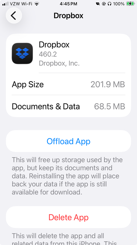 I have had a Dropbox Plus account for several years. I have the latest version of the Dropbox app (460.2.2) installed on my iPhone with iOS 18.7.1. When I was unable to upgrade to the latest iOS version and when I could no longer backup my iPhone to iCloud, I found that copying photos and videos from my iPhone camera roll to specific folders in Dropbox, deleting those items from my iPhone camera roll, and then deleting all the items in the Recently Deleted folder in my camera roll did not free up storage on my iPhone. I cleared the Dropbox cache on my iPhone and confirmed that I did not have any offline files. However, I did find that the Dropbox Photos folder on my iPhone had copies of all the uploaded files. Consequently, moving photos and videos to the Dropbox cloud did not free up space on my iPhone.